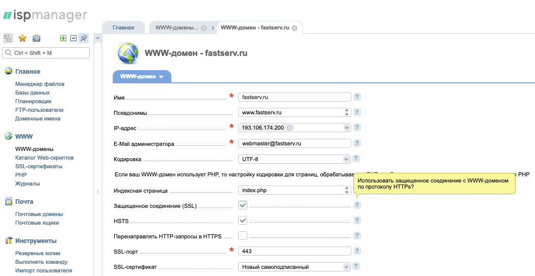 Далее в раздел WWW домены и подключите SSL в настройках нужного вам домена