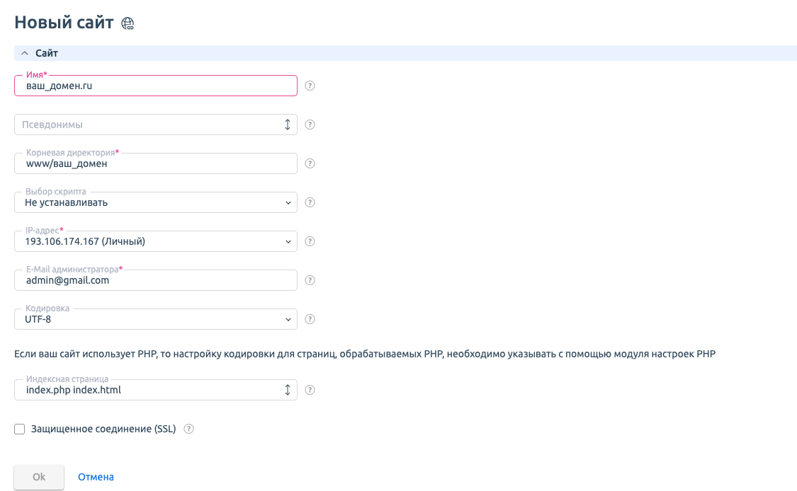 Далее в форме заполните данные домена - сайта и нажмите кнопку "ОК" - в нижней части экрана