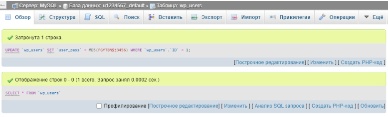 В открывшемся окне в строке user_pass выберите в выпадающем списке функцию MD5, в соседнем окне введите новый пароль администратора. Запомните или запишите новый пароль — именно по нему осуществляется вход в админку CMS. Затем нажмите Вперёд внизу страницы.
