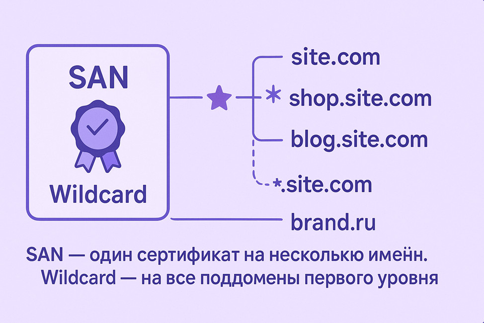 - SAN — один сертификат на несколько доменов (site.com, blog.site.com, brand.ru).